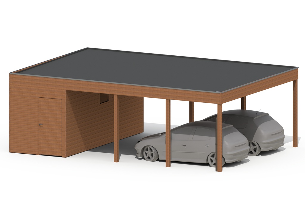 - Mogelijkheid om een gesloten bergruimte aan te bouwen, ideaal als fietsberging of voor het opbergen van tuinmeubelen. Zelfde binnenhoogte als carport. Bodem niet inbegrepen: hiervoor kunnen eventueel houten terrastegels of terrasplanken aangeschaft worden.