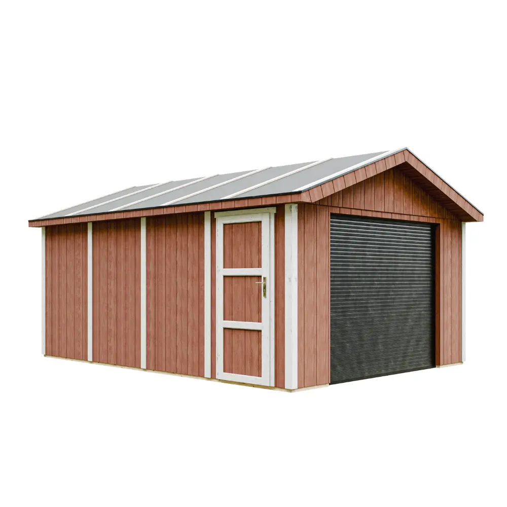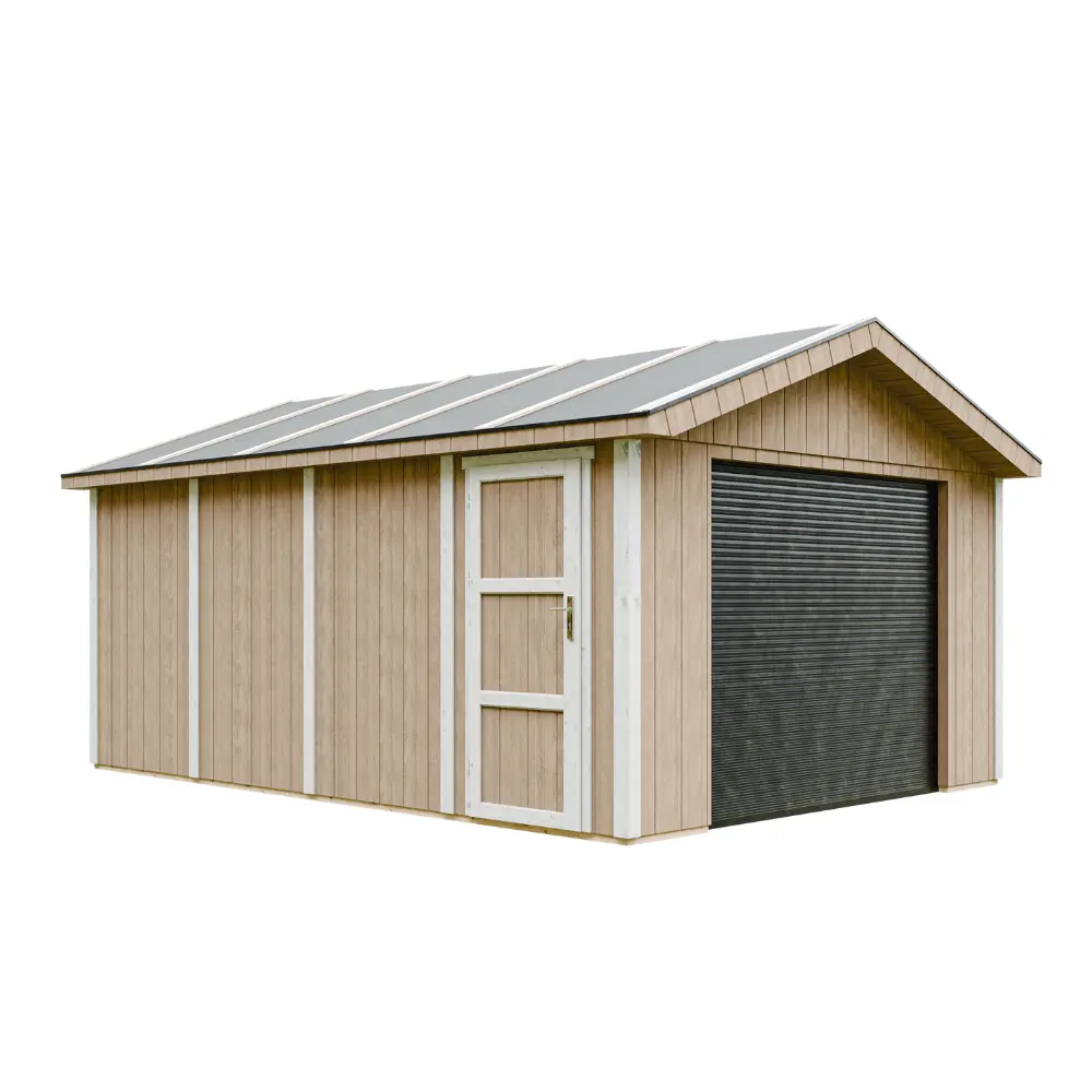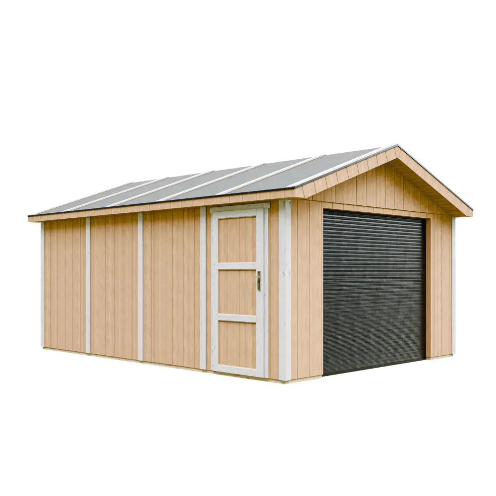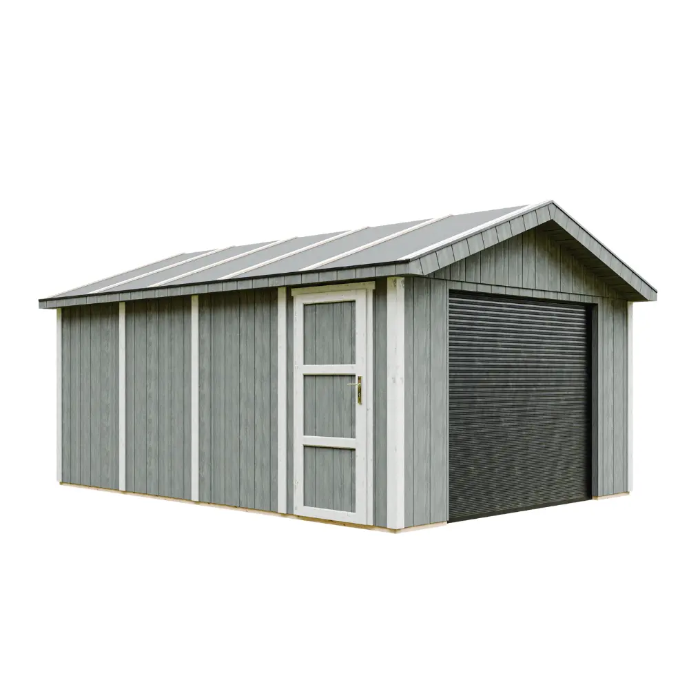 De wanden van de garage zijn opgebouwd uit een stevig houten frame van 60×60 mm, afgewerkt met 10 mm dikke LP® SmartSide® panelen met primerlaag.