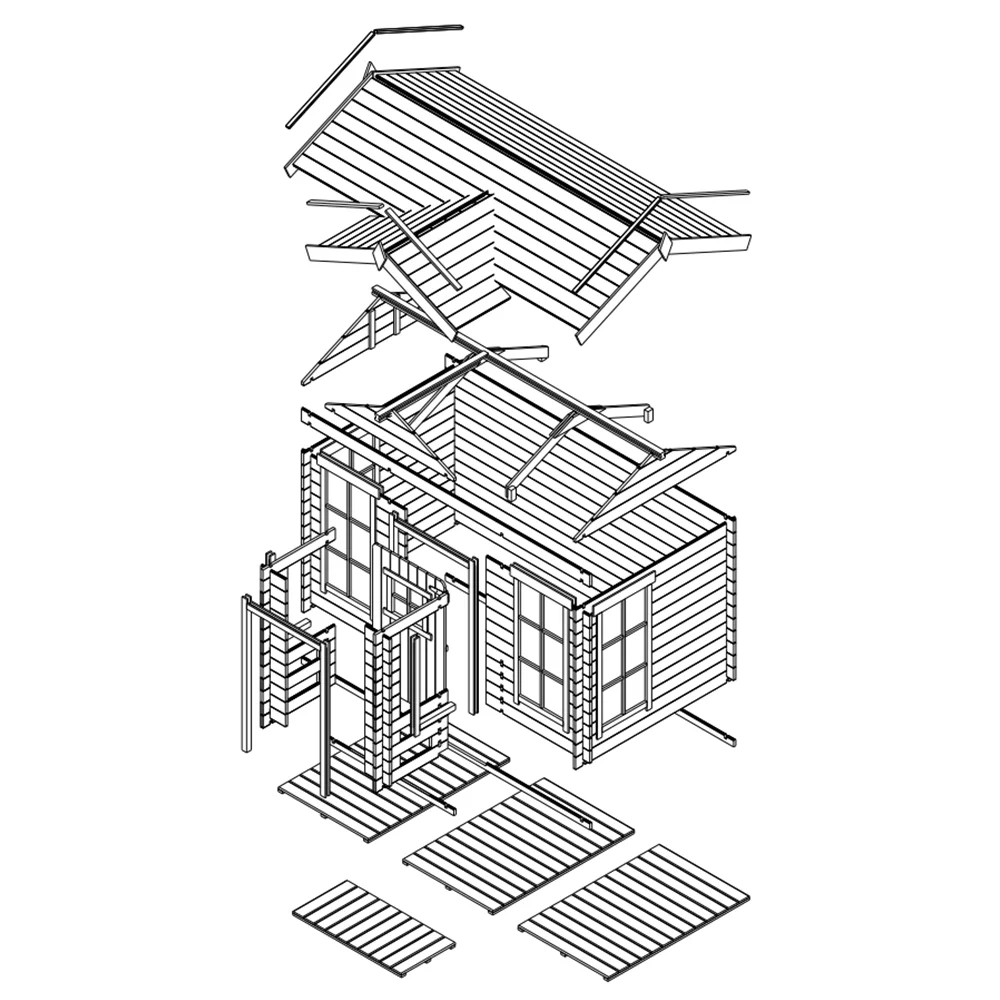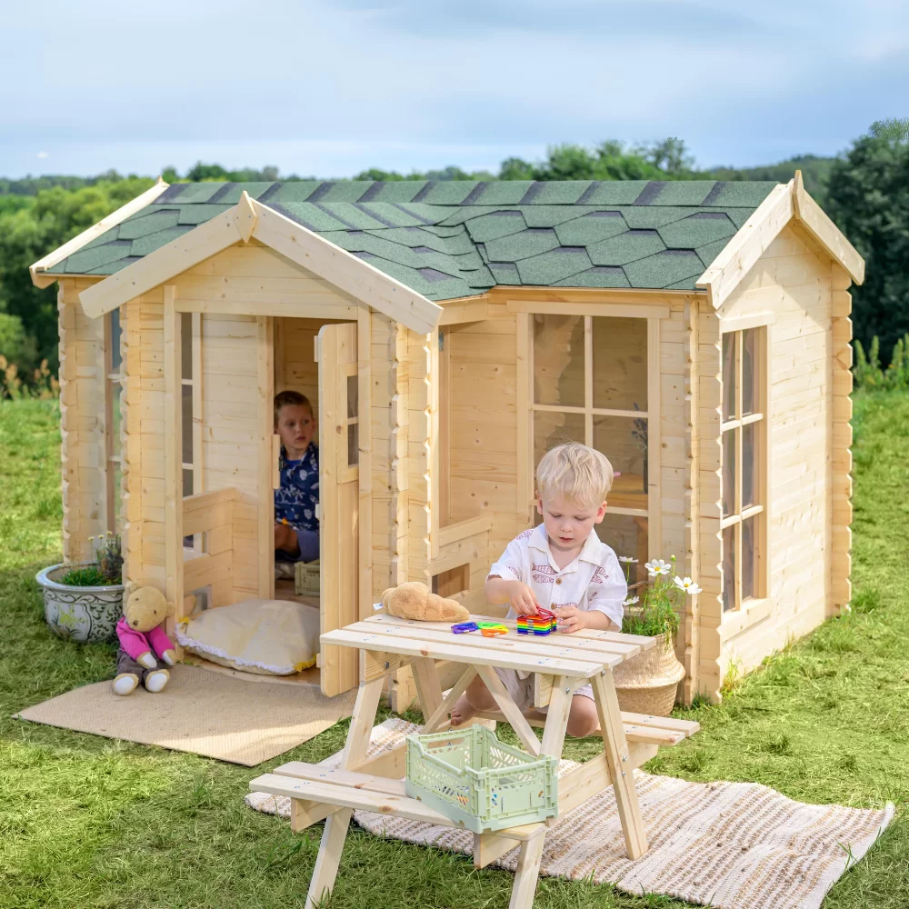 De constructie van het speelhuis is gebaseerd op tand-en-groefverbindingen en kan door één persoon eenvoudig worden gemonteerd. Alle onderdelen worden veilig verpakt geleverd met duidelijke montage-instructies, waardoor het een ideaal DIY-project is.