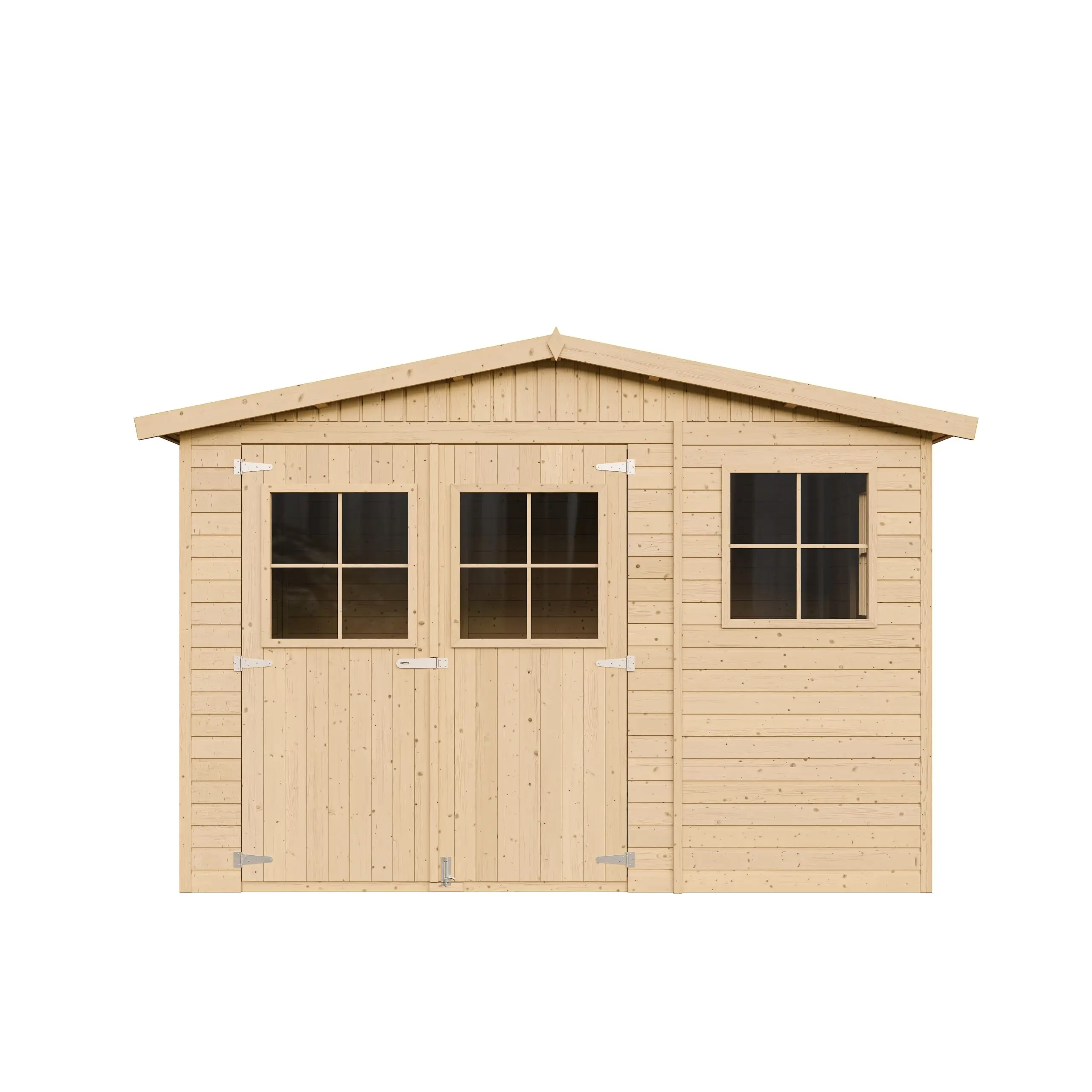 Dit tuinhuis is opgebouwd uit voorgefabriceerde panelen van 17 mm dikke houten planken, wat zorgt voor een solide en duurzame structuur.