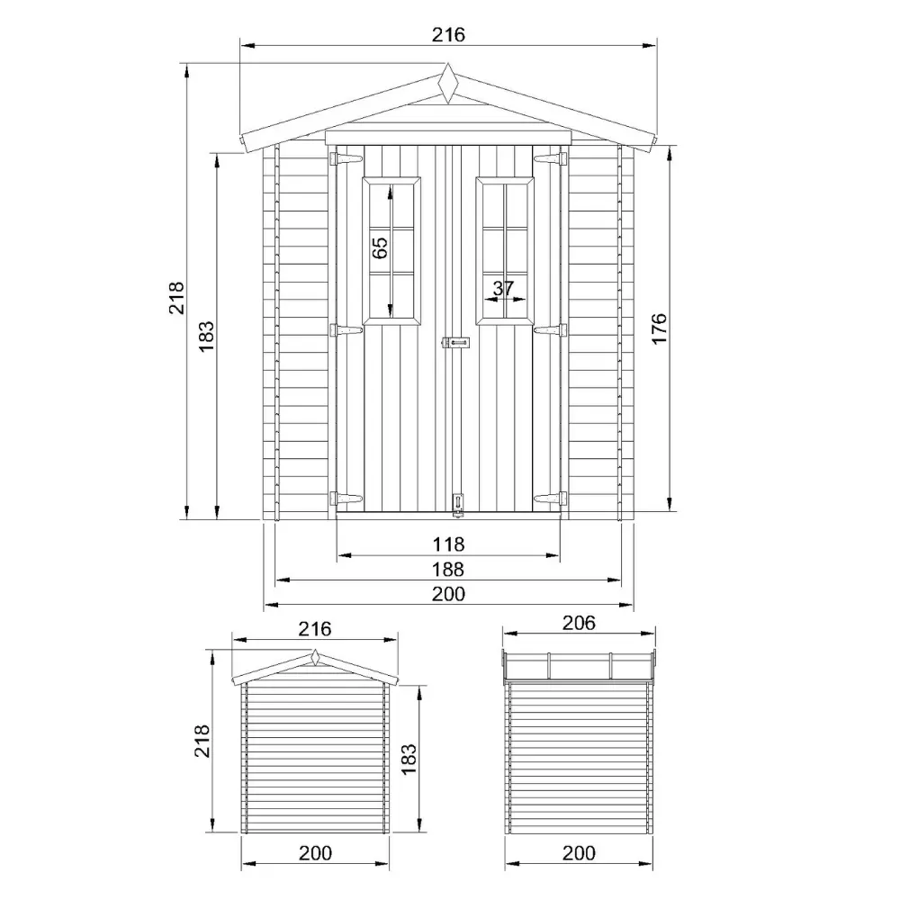 Het tuinhuis heeft een breedte van 200 cm, lengte van 200 cm en een totale oppervlakte van ongeveer 4 m². De totale hoogte bedraagt 218 cm.