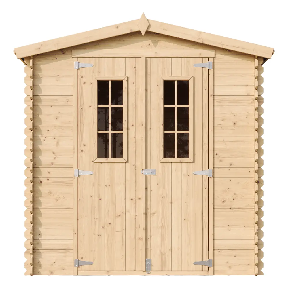 De structuur van dit houten tuinhuis M343C is gebaseerd op het planken-inkliksysteem, waarbij de wanden in elkaar grijpen.