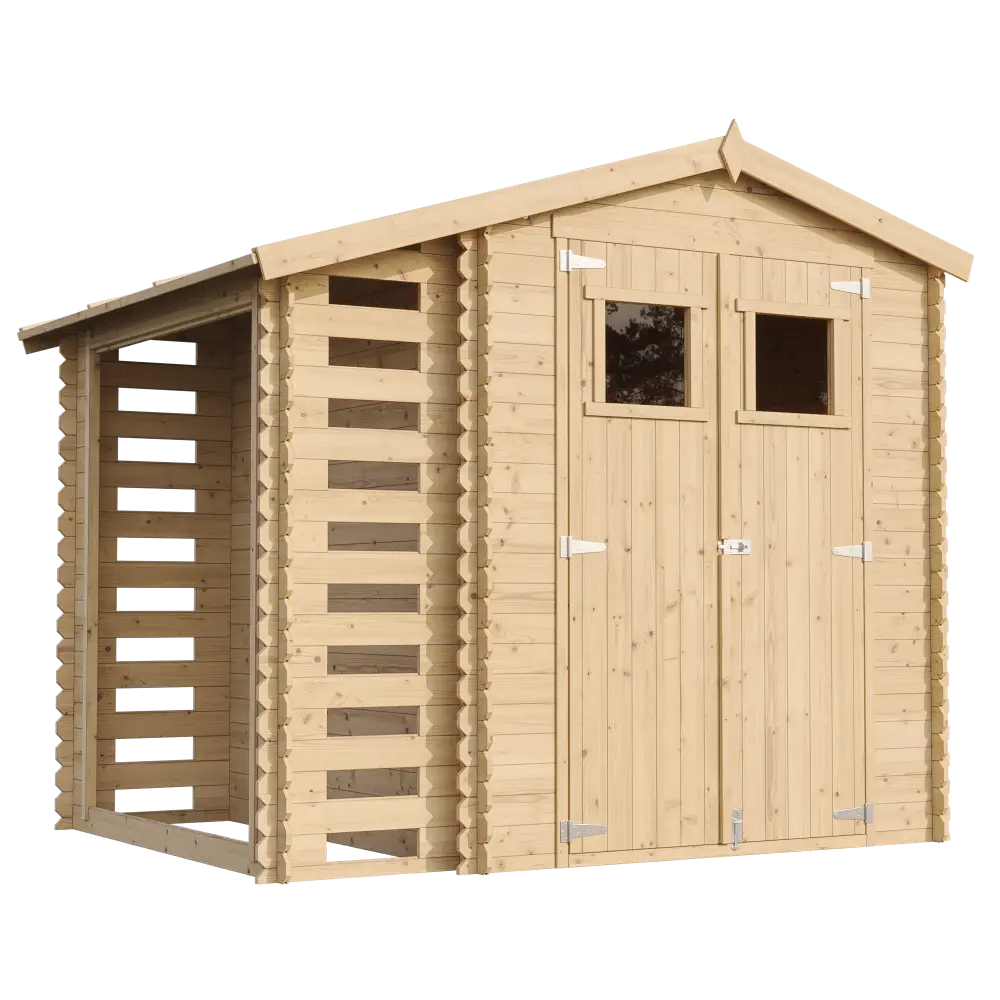 Het tuinhuis is opgebouwd uit 19 mm dikke massieve houten planken van hoogwaardig Noord-Europees dennen- en vurenhout. Het dak is gemaakt van OSB-3 dakplaten (12 mm) met bitumen dakbedekking, wat zorgt voor stevigheid en bescherming tegen weersinvloeden.