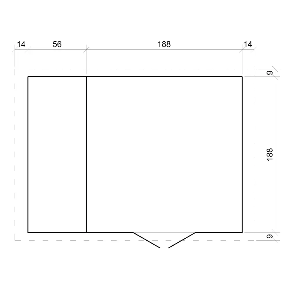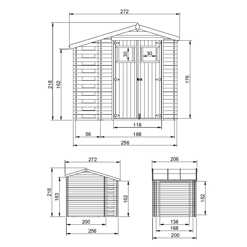 Het houten tuinhuis M386 heeft een buitenmaat van 256 × 200 cm en een hoogte van ca. 218 cm, met een totale oppervlakte van ongeveer 5 m². Dit maakt het een ruime en functionele tuinberging voor fietsen, tuingereedschap en andere spullen.