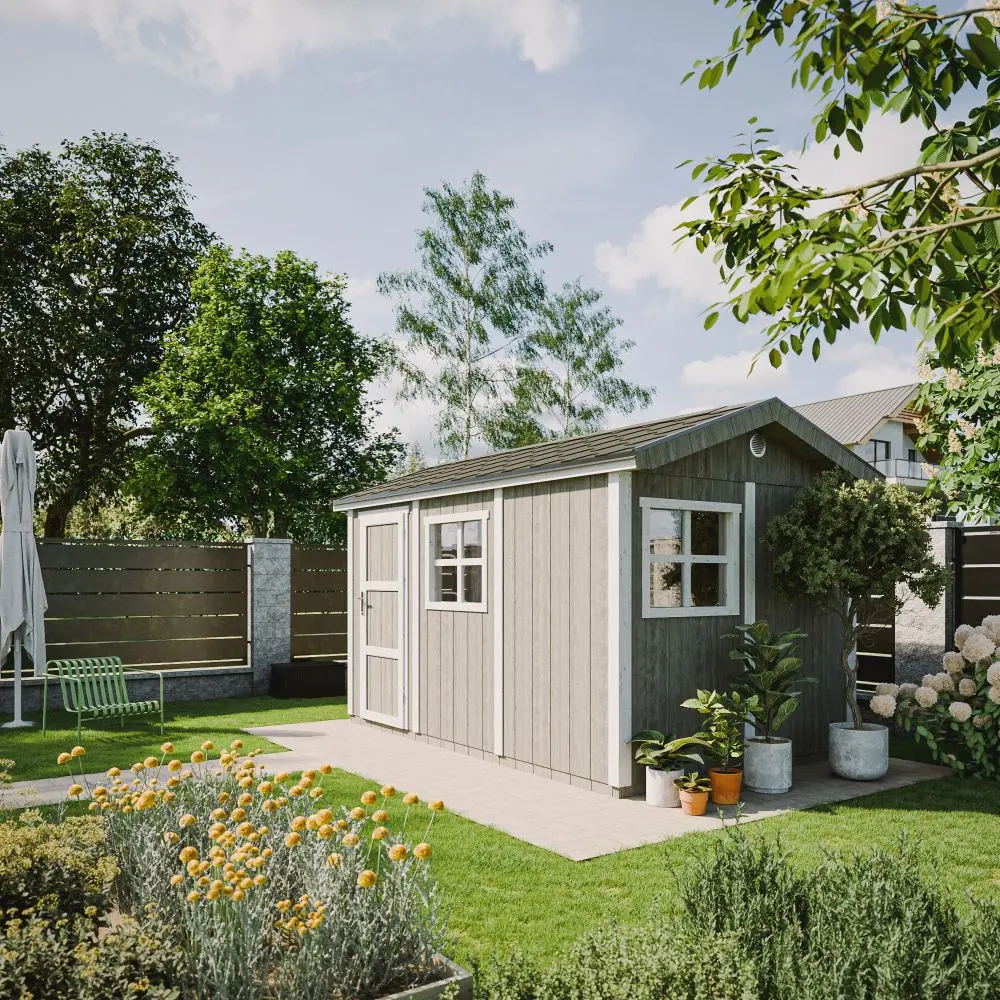 Met zijn strakke vormgeving en onderhoudsarme afwerking past dit tuinhuis perfect in elke buitenruimte – van een moderne stadstuin tot een landelijke omgeving.