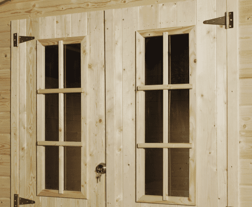 Dit tuinhuis beschikt over een solide dubbele plankendeur met heldere plexi, wat zorgt voor voldoende daglicht en tegelijk een veilige toegang biedt. Daarnaast is er een vast raam dat extra natuurlijk licht naar binnen laat.:contentReference[oaicite:3]{index=3}