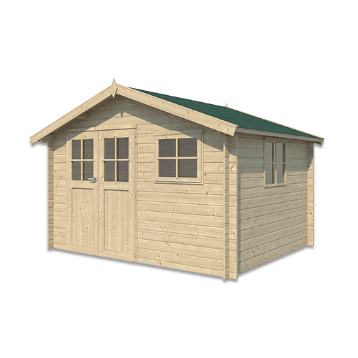 Een klassieke blokhut van 28 mm massief vurenhout met winddichte hoekverbinding en royale opslagruimte.