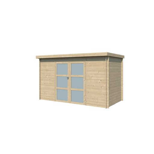 Het Woodlands tuinhuis Nyborg 9203 is een ruime, moderne blokhut met winddichte 3D hoekverbinding voor superieure stabiliteit en een strakke, hedendaagse uitstraling. Met een grondmaat van 325 × 175 cm (inclusief 10 cm dakoverstek vooraan) en een constructie in 19 mm massief vurenhout biedt dit model meer dan genoeg ruimte voor tuingereedschap, fietsen, tuinmeubilair, kussens of grotere opslag. Het bijna platte lessenaarsdak (slechts 1,6° helling) en de rechte plankuiteinden zorgen voor een minimalistische, eigentijdse look die perfect past in moderne tuinen.