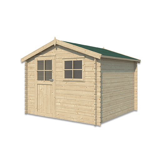 Een klassiek houten tuinhuis in blokhutstijl met 28 mm massief vurenhout en winddichte hoekverbindingen.