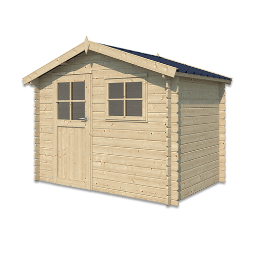 Een klassiek houten tuinhuis in blokhutstijl met 28 mm massief vurenhout en winddichte hoekverbindingen.